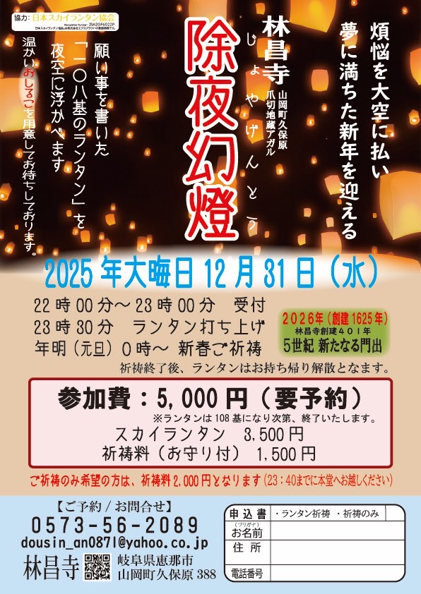 年末のイベント受付開始 2025 9/17 お知らせ 行事 除夜幻燈 2025年9月17日 ランタンは、108になり次第終了となります お申し込みはこちら お知らせ 行事 除夜幻燈 ワークショップ開催のご案内:6/28日(土)13:30~ 千手観音さまの顔ハメパネル設置のご案内 関連記事 千手観音さまの顔ハメパネル設置のご案内 2025年9月17日 ワークショップ開催のご案内:6/28日(土)13:30~ 2025年6月23日 ホームページを開設しました。 2025年1月10日